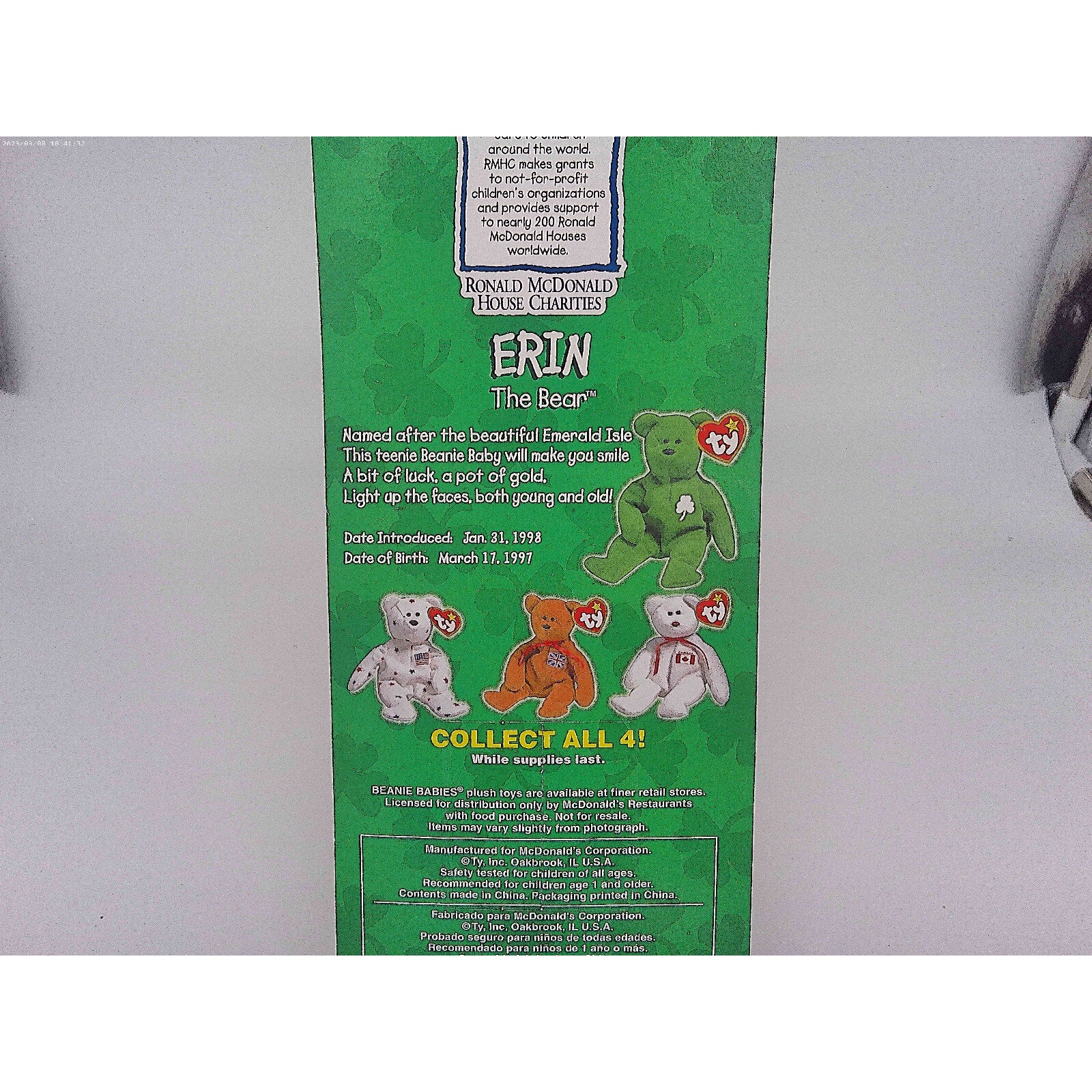 Erin The Bear-1996 McDonalds Ty Beanie Baby with Rare Errors 1993, OakBrook