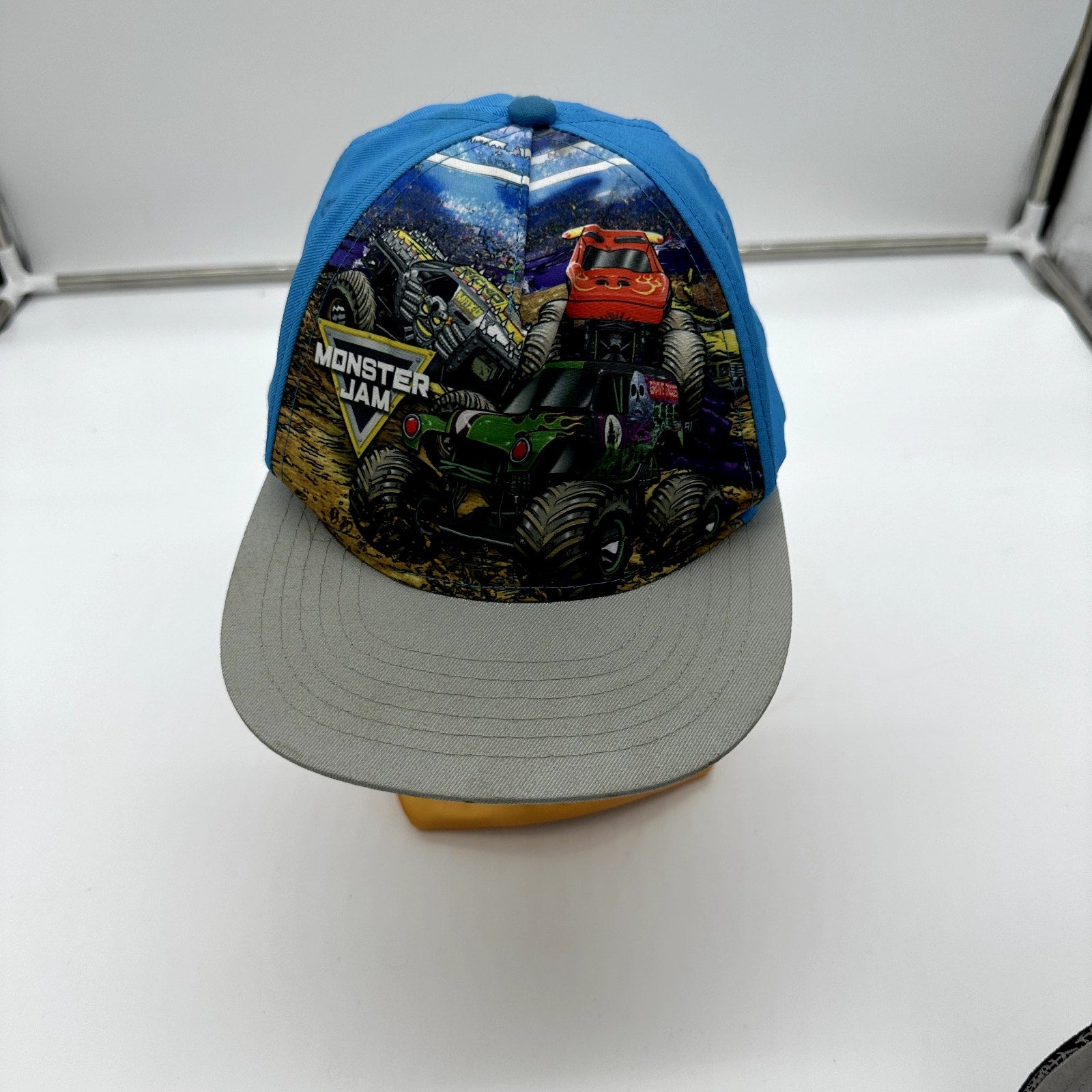 The Kids Monster Jam Flat Brim Adjustable Hat in Blue features various Monster Jam vehicles including the Grave Digger, Max... Read more